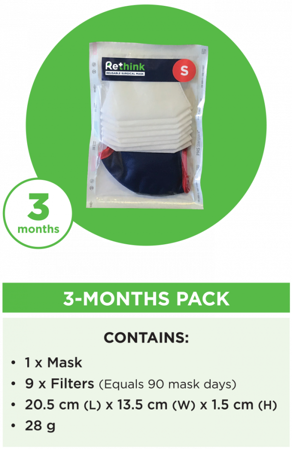 The Rethink Reusable Surgical Mask™ (Type I) is a full-fledged surgical mask that meets international performance requirements for Type I surgical masks, including ≥ 95% bacterial and particle filtration efficiency and high breathability ( < 40 Pa/cm2). The important difference between this mask and single-use alternatives is that the mask uses state-of-the-art nanofiber filters that can be used 10 times with simple hot water disinfection between uses. This revolutionary capability reduces cost of use, whilst reducing logistics and PPE waste volumes by 90%. The 3-month Set includes a carrier mask and 9 nanofiber filters that ensure medical grade mask performance for at least 90 days. This tiny package (20.5 cm (L) x 13.5 cm (W) x 1.5 cm (H)) weighs only 28 grams.This is a proudly African innovation and is manufactured and shipped from Cape Town, South Africa. This further reduces shipping costs and lead times.