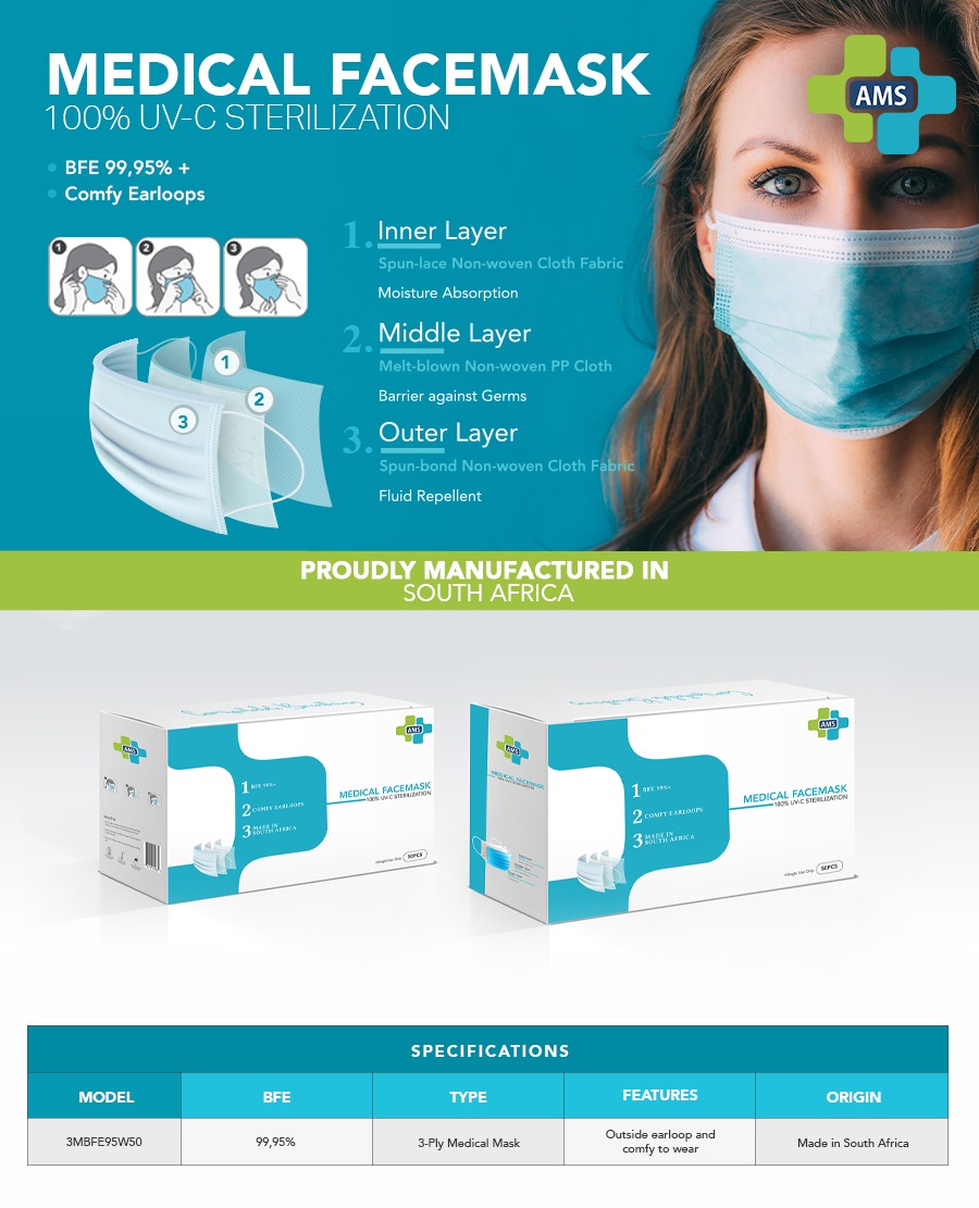 AMS 3-PLY MEDICAL MASK, BLUE BOX OF 50, BFE RATED 99.95 SAHPRA LICENSED***PODUCTION DATE, MACHINE NUMBER, BATCH NUMBER & EXPIRY ON PRODUCTS/MEDICAL GRADE MASK***