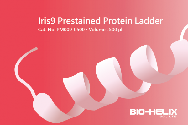 The Iris9 Prestained Protein Ladder is a three-color protein standard with 9 pre-stained proteins covering a wide range molecular weight from 15 to 180 kDa. Proteins are covalently coupled with a blue chromophore except for four reference bands (two green bands at 15 kDa & 60 kDa and two red bands at 30 kDa & 70 kDa respectively) when separated on SDS-PAGE (Tris-glycine buffer). The Iris9 Prestained Protein Ladder is designed for monitoring protein separated during SDS-polyacrylamide gel electrophoresis, verification of Western transfer efficiency on membranes (PVDF, nylon or