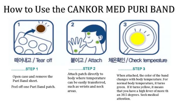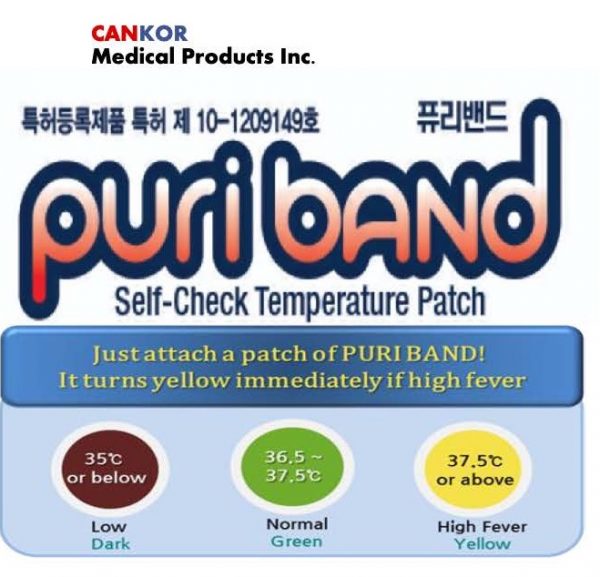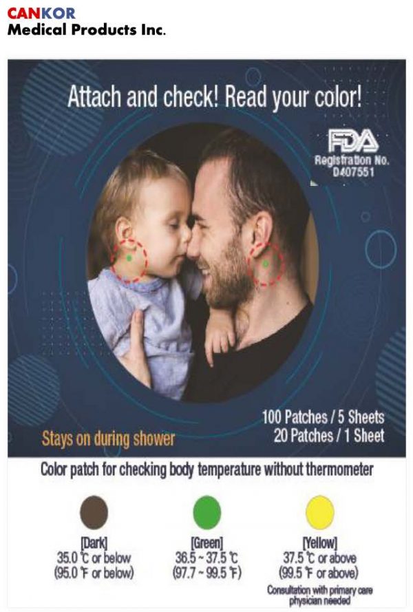 FDA approved Self-Check Temperature Patch. Measures body temperature by changing colour from small patch sticker. When attached, the color of the band changes with body temperature. For normal body temperature, it turns green. If it turns yellow, it means that you have a high fever of more than 38.5 degrees, so you need to see a nearby medical institution.It is used by attaching it directly to places where body temperature can be easily transferred, such as wrists and neck areas. (However, may vary depending on skin condition and body part.)- Korea's first registration of a "color-marked thermometer" under the Medical Devices Act- FDA registration Number: D407551- Durable: remains effective for 3 -4 days and can withstand washing or shower.