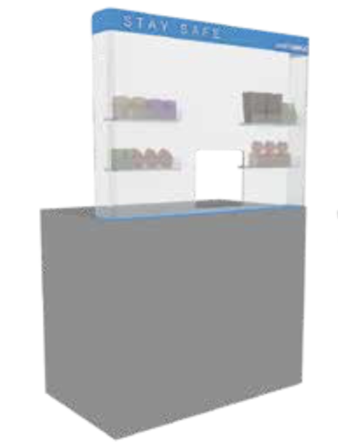 -COUNTERSHIELD is fixed onto the selling counter with a double side tape (tape comes in the box). The counter shield has a rectangular opening at cashier’s desk level to allow payment procedure to take place.