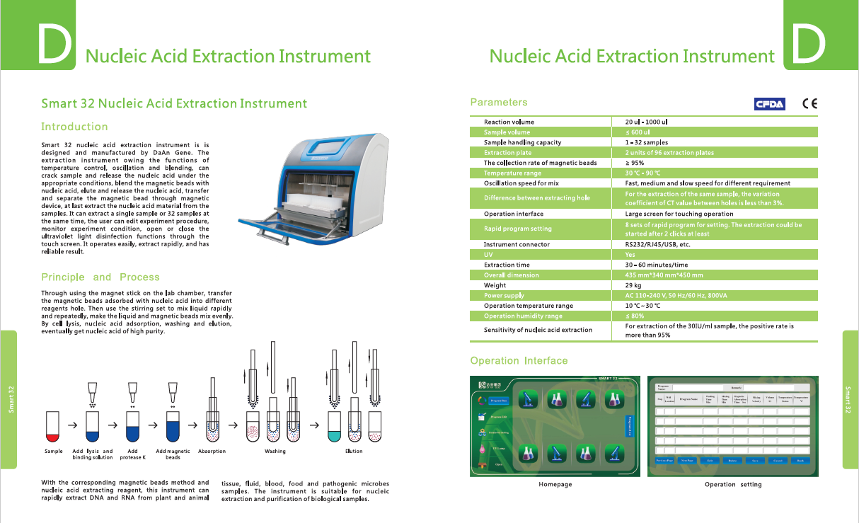 Smart 32 nucleic acid extraction instrument is is designed and manufactured by DaAn Gene. The extraction instrument owing the functions of temperature control, oscillation and blending, cancrack sample and release the nucleic acid under the appropriate conditions, blend the magnetic beads with nucleic acid, elute and release the nucleic acid, transferand separate the magnetic bead through magnetic device, at last extract the nucleic acid material from the samples. It can extract a single sample or 32 samples atthe same time, the user can edit experiment procedure, monitor experiment condition, open or close the ultraviolet light disinfection functions through thetouch screen. It operates easily, extract rapidly, and has reliable result.