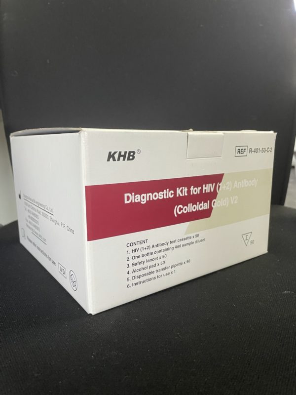 50T/Kit. Accessories provided.The Diagnostic Kit for HIV (1+2) Antibody (Colloidal Gold) V2 from KHB is an in vitro, visuallyread test for the qualitative determination of antibodies against HIV-1 and HIV-2 in humanserum, plasma, venous and capillary whole blood. This product is intended for use as an aidto detect antibodies against HIV (1+2) from individuals suspected to be infected by HIV.It is intended to be used by laboratory professional and health care workers atpoint-of-care.
