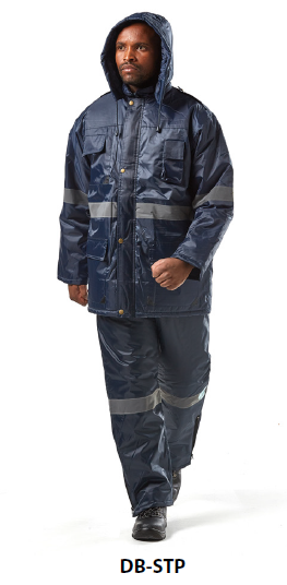 Dromex® Storm Polar DB-STP-J and DB-STP-P, reflective storm and freezer wear thermal protective attire is a water-resistant jacket and pants suit, protecting the body and undergarments from the hazards of rain, water splashes, and cold temperatures.