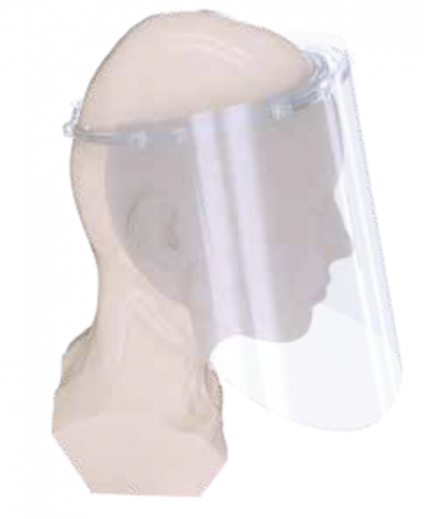 The face shield is wide enough to cover the entire face and extends to cover the ears.