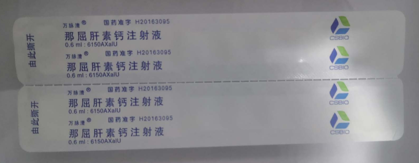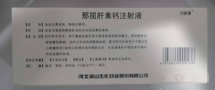 The main ingredient of this product is nadroparin calcium, which is a calcium salt of aminodextran (heparin) fragment obtained from porcine small intestinal mucosa. 1ml injection contains nadroparin calcium 9500IU anti-factor Xa (European Pharmacopoeia unit. It is equivalent to WHO unit 10250IU anti-factor Xa). In this specification, except for the unit in the specification is WHO unit, all other units used are European Pharmacopoeia units.