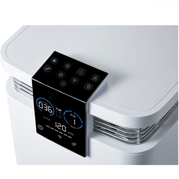 Coverage area of up to 1500sqft, Suitable for large room, cafeteria, hospitals etc. WiFi enabled, can be controlled using smart phone via TUYA app, comes with pre installed HEPA filter and activated carbon ion filter and UV kit