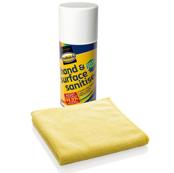 PROSOLVE Surface Sanitiser Cloth & Spray Pack.Suitable for use where you need to quickly and effectively santitise small areas (i.e. desks, keyboards, phones, protective screen etc)