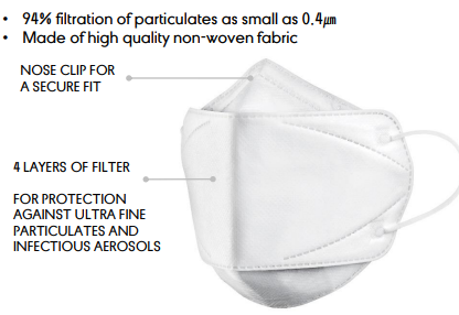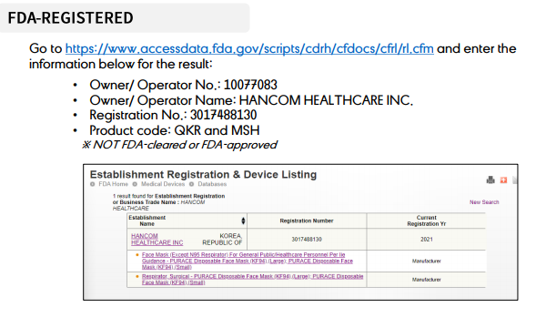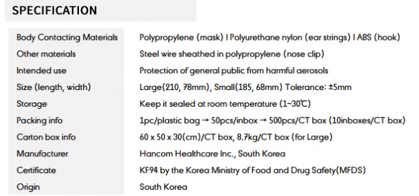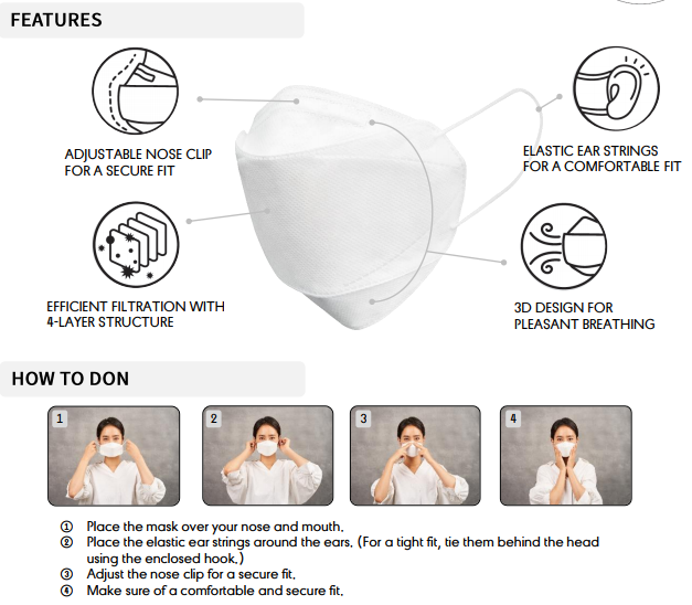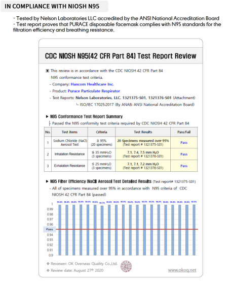 The product approved by South Korea FDA, US FDA listed and CE certified. Blocking more than 94% of average size particle (0.4㎛). CDC NIOSH N95(42 CFR Part 84) Test Passed.