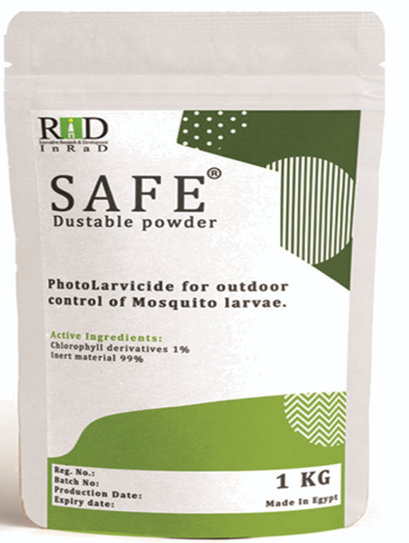 SAFE® is an abbreviation of Sunlight Activate Formulated Extract. SAFE is the first natural larvicide that employs advanced green technology in mosquito-borne disease control effectively killing mosquito larvae. Being environmentally friendly, SAFE is completely safe for humans. The active ingredients are chlorophyll derivatives. Chlorophyll is an FDA-approved food additive and is completely safe for humans. SAFE is a dustable powder that can be applied to temporary and permanent breeding sites (swamps, marshes, ponds, spring water, water harvest, and irrigation area). SAFE is activated by light to produce singlet oxygen which is considered a toxic species for mosquito larvae. SAFE is a target selective formula, it is used only for mosquito larvae without any effect on the other non-target organisms in the same breeding site. The SAFE package is divided into two parts, a primary interior plastic bag, and a secondary exterior aluminum bag.