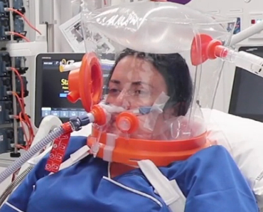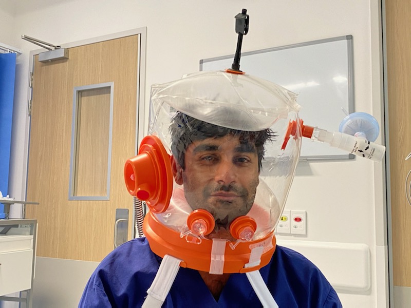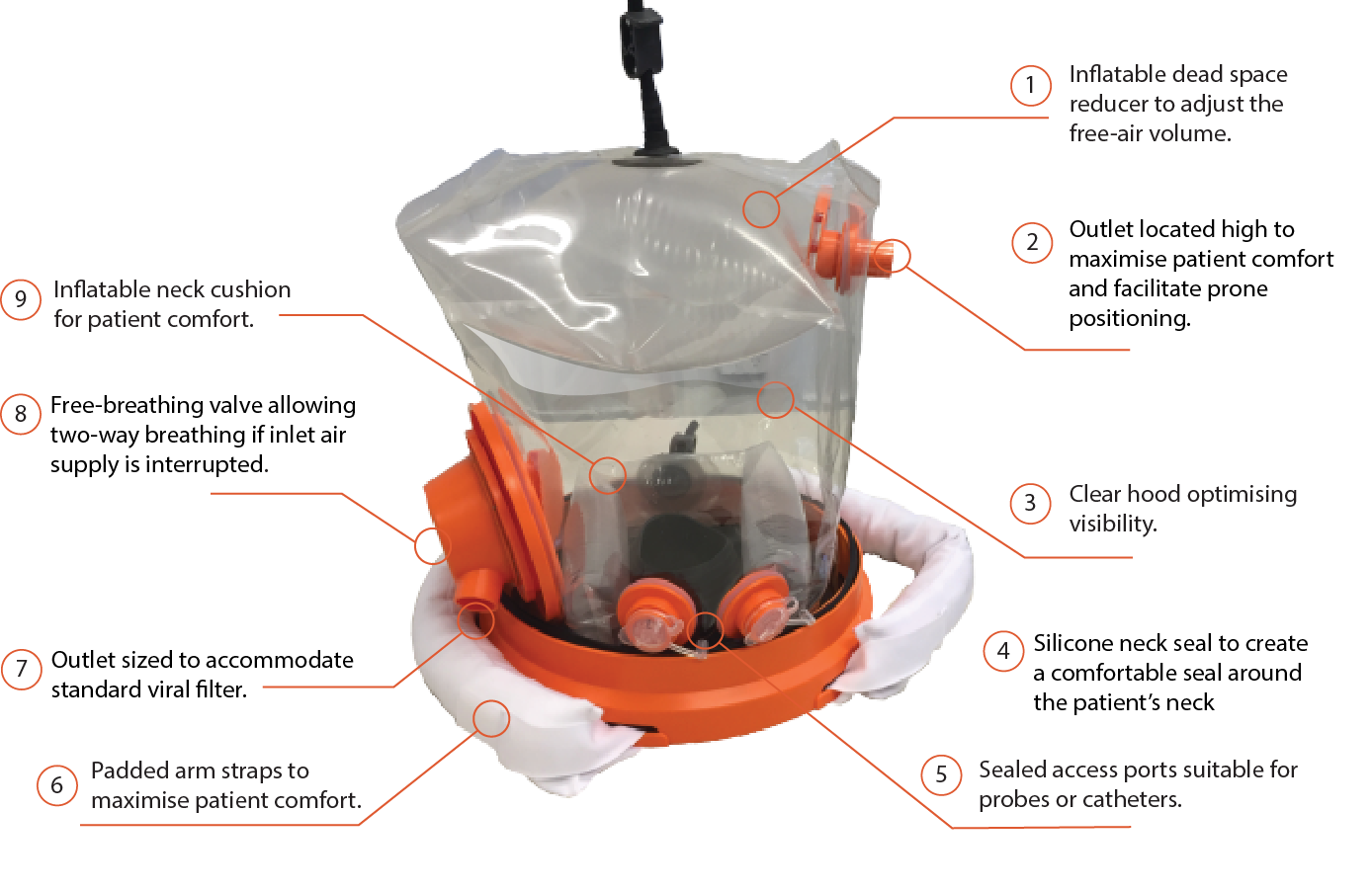 Circular in shape, the ventilator hood is founded on a 3D printed, orange base which is lined with a silicone neck seal. The patient's head can be inserted through the seal into a transparent, plastic hood. An inflatable neck cushion on the hood's interior provides patient comfort. This is inflated with a black valve at the rear of the hood which has a clip to adjust the amount of air held within the cushion. At the front of the hood are two orange, sealed access ports suitable for probes or catheters. On the left of the hood is a large, orange free-breathing valve which allows for two-way breathing if the inlet air supply is interrupted. An outlet on the valve allows a standard viral filter to be attached. Next to the large valve is a smaller outlet. On the right of the hood is another small outlet, positioned high to maximize patient comfort and facilitate prone positioning. At the very top of the hood is a vale that connects to an inflatable dead space reducer to adjust the free-air volume. Attached to both sides of the hood is a white, padded merino arm strap. This is attached to the orange base of the hood with velcro.