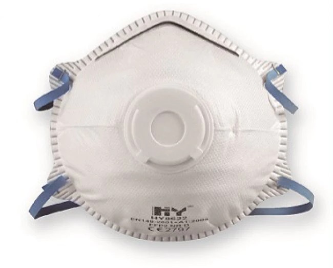 FFP2 Disposable respirator to protect against inhalation of droplets and particles. With exhalation valve and double head bands.