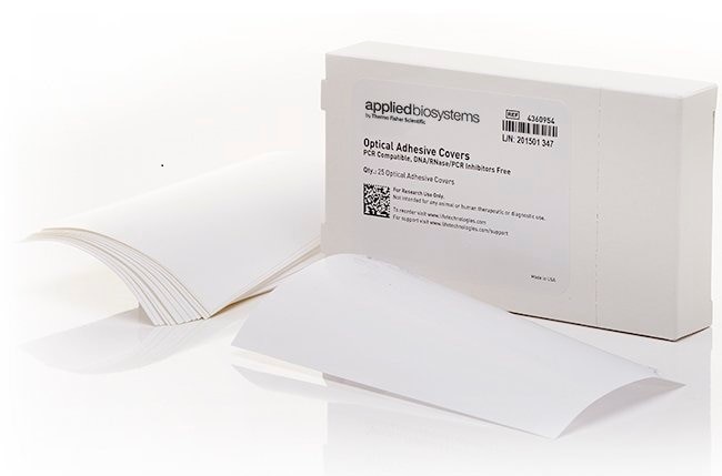The Applied Biosystems® MicroAmp® Optical Adhesive Film reduces the chance of well-to-well contamination and sample evaporation when applied to a microplate.Features:- Pressure-sensitive adhesive provides a tight seal over every well- Will not interfere with sample reading- Press-N-Seal: Align properly to the plate, then press to seal- Easy to apply-will not stick to your gloveUse this optically-clear adhesive film to seal the samples into the wells of a microplate. This will reduce the possibility of cross-contamination between sample wells and help ensure consistent Real-Time PCR data.Simply peel the backing away from the adhesive film and apply firmly across the top of your microplate. Stack microplates and read samples as you would normally except with less chance of sample contamination. Designed to fit on MicroAmp® 96-well and 384-well plates.